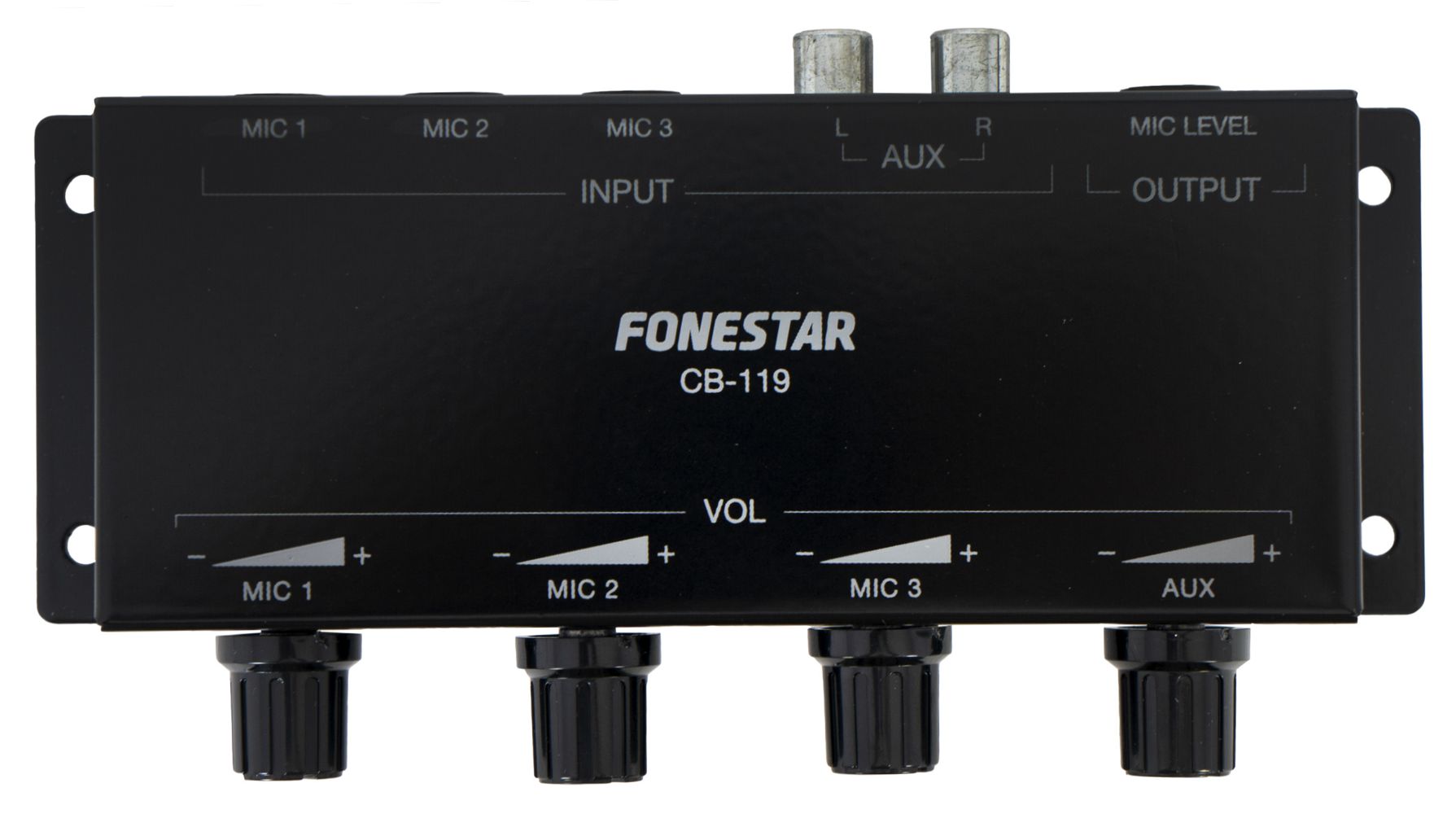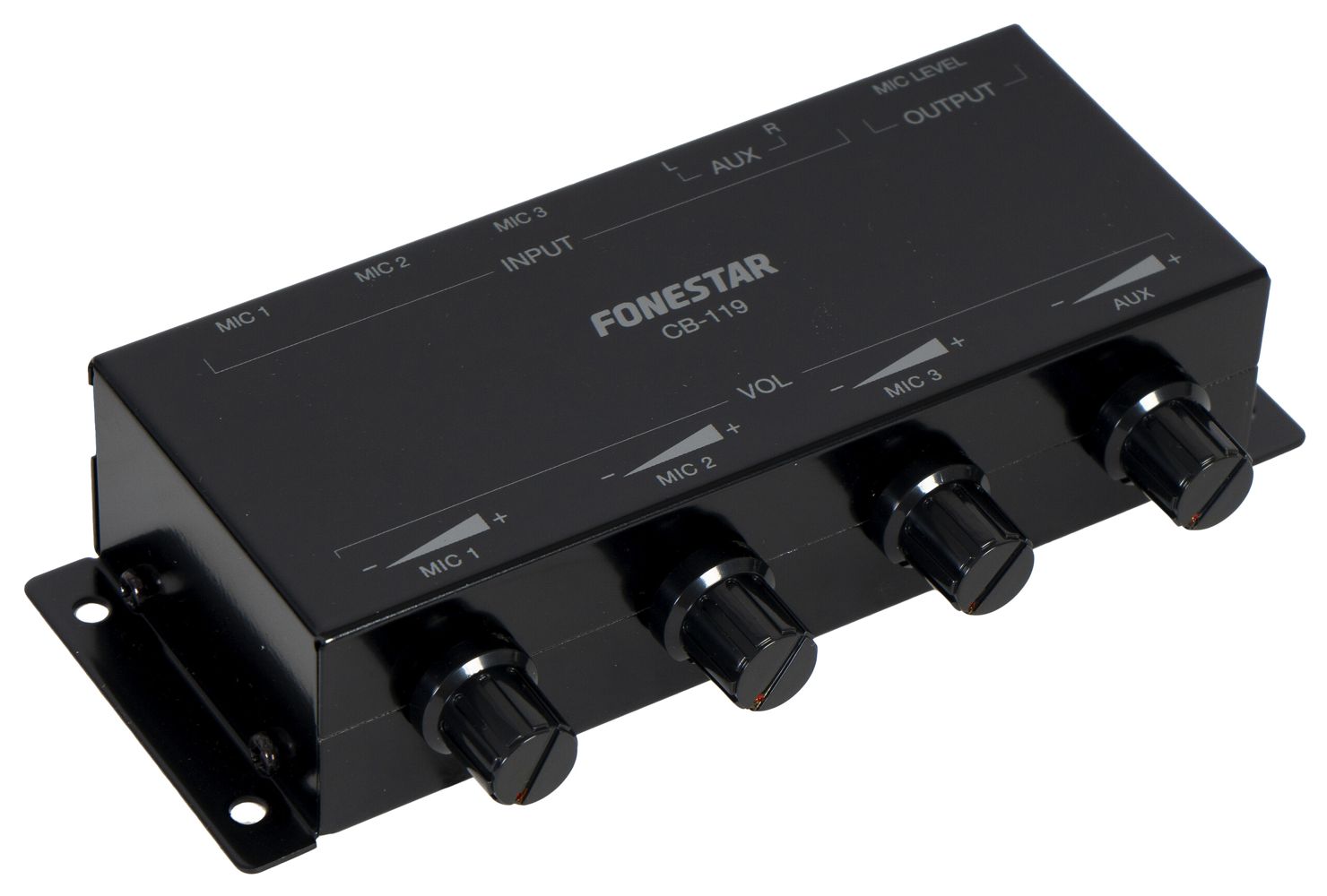 Passive mono mixer with 3 microphone inputs and 1 auxiliary input.