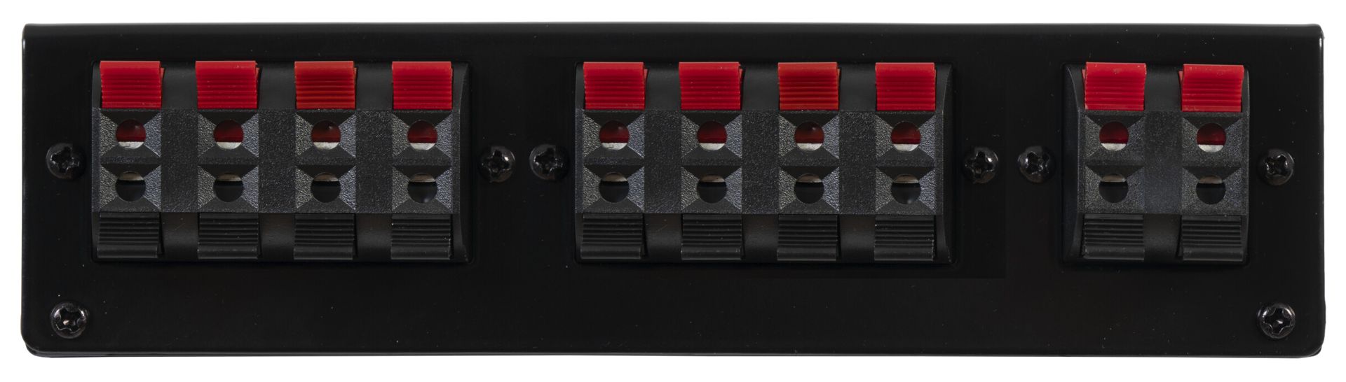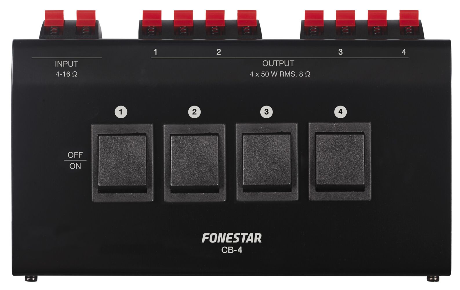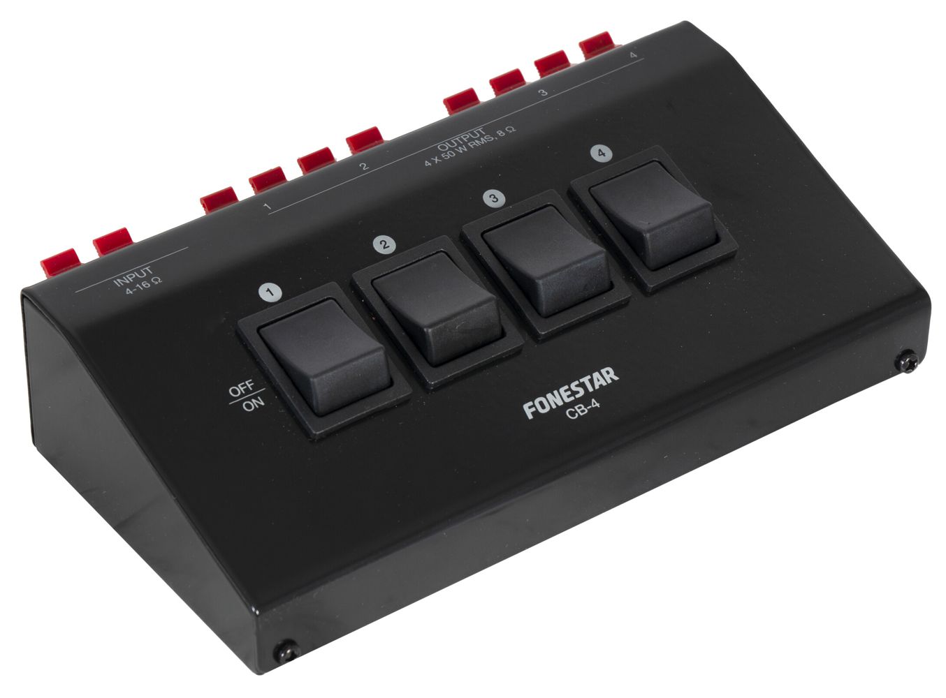 Stereo 4-way selector for 4 pairs of low impedance speakers.