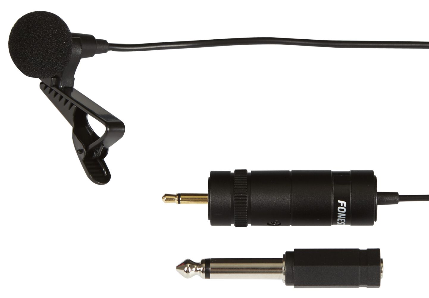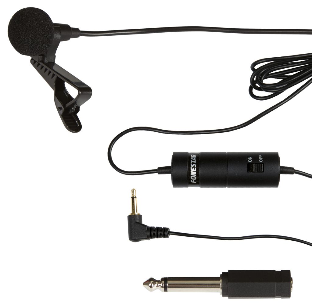 Electret condenser lavalier microphone with adapter for dynamic microphone input.