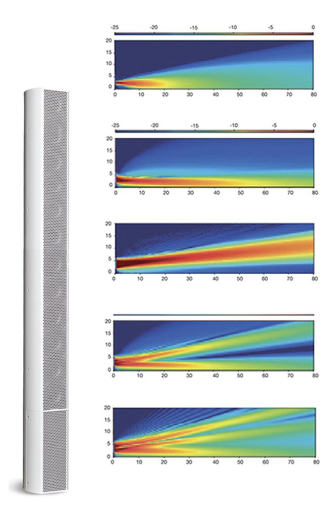 • Adjustable beam steering: acoustic centre, aperture angle (5º to 25º), inclination (-5º to 25º), shape (symmetrical/asymmetrical), up to 3 sound beams