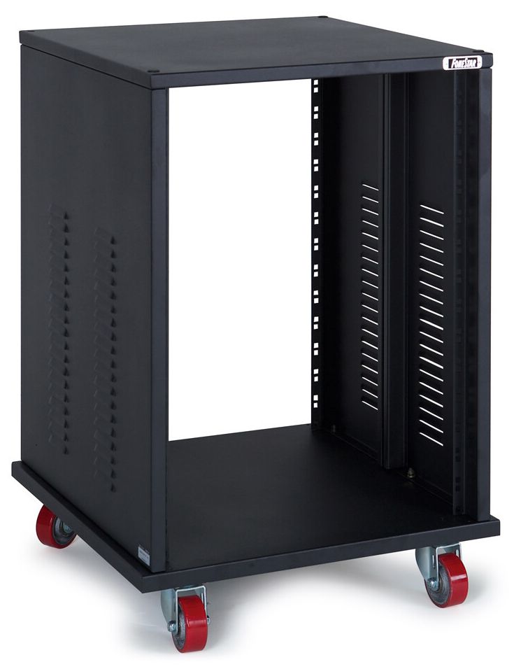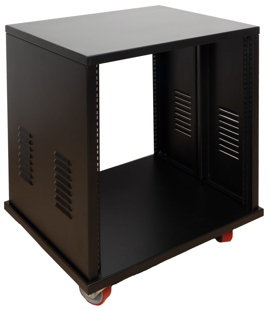 - Metal 19" rack cabinet, open back/front and wheels with brakes
