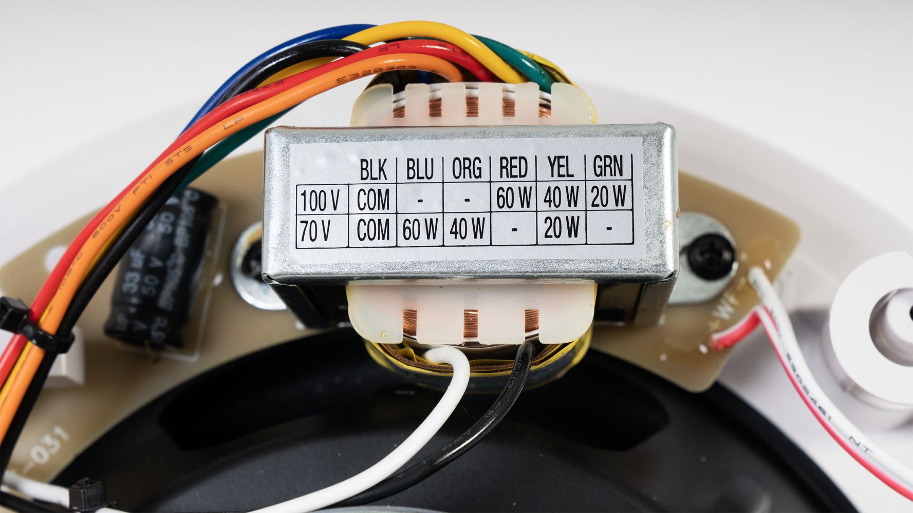 Ceiling subwoofer, with 100 V line transformer and round grille.