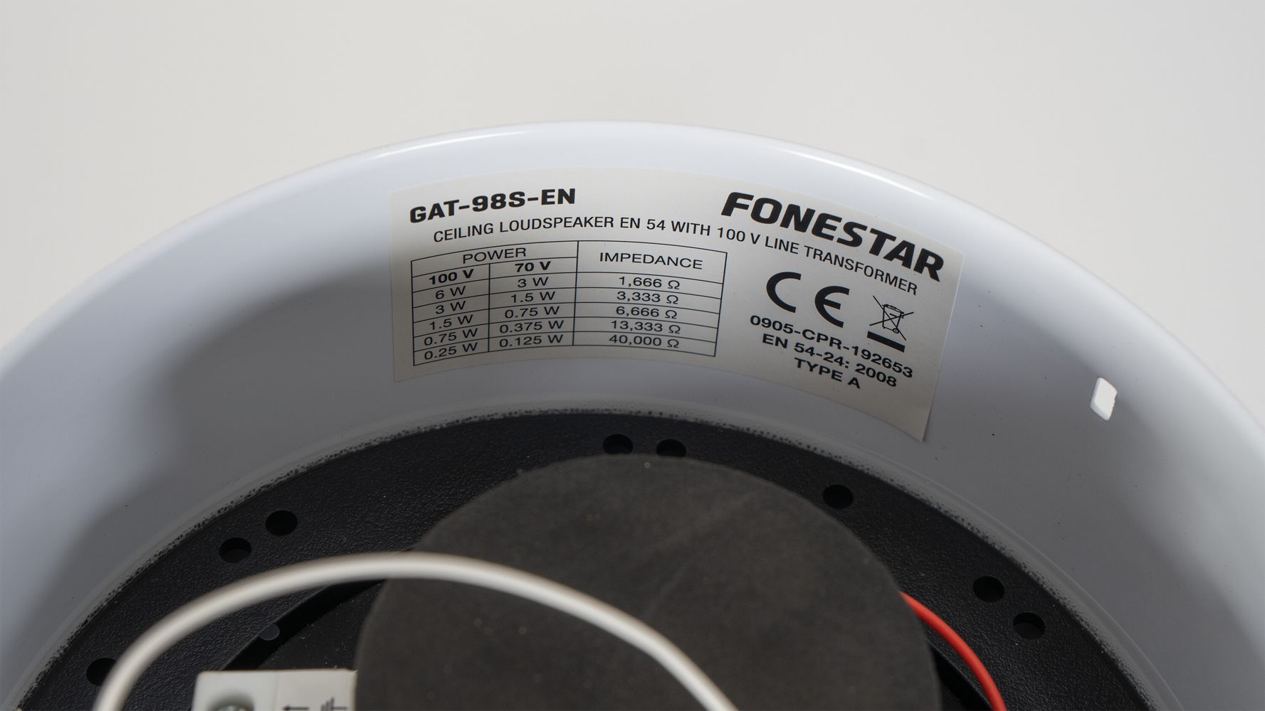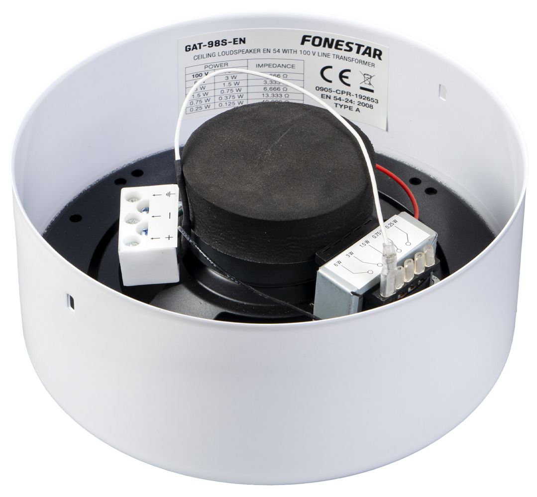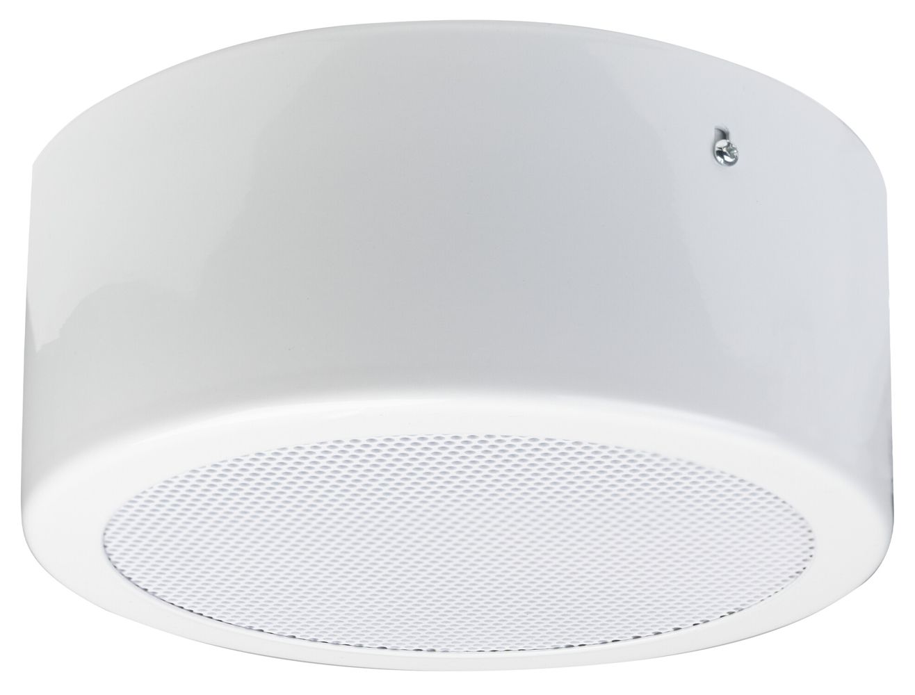 - Surface mounted ceiling loudspeaker EN 54 with 100 V line transformer, round grille and fireproof enclosure.