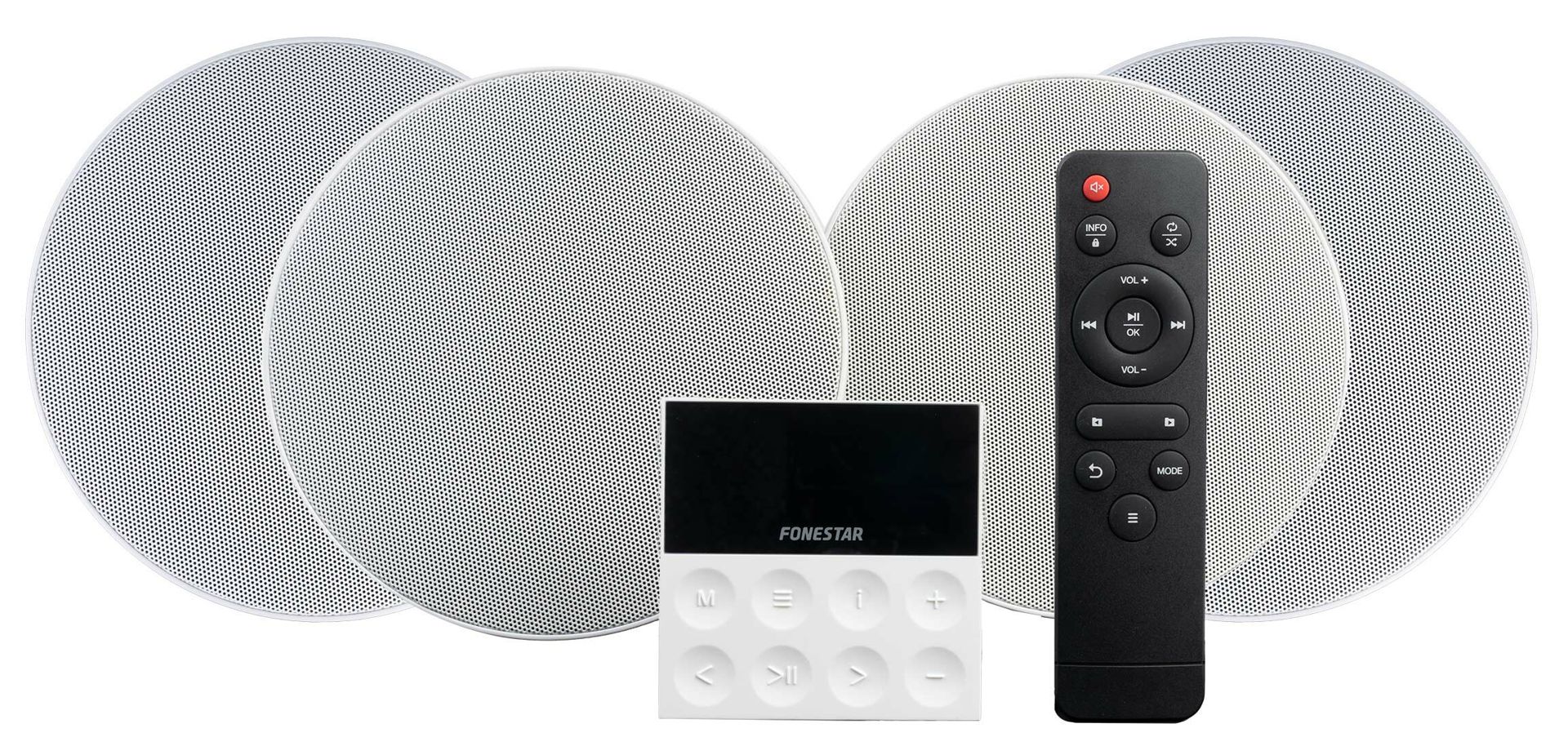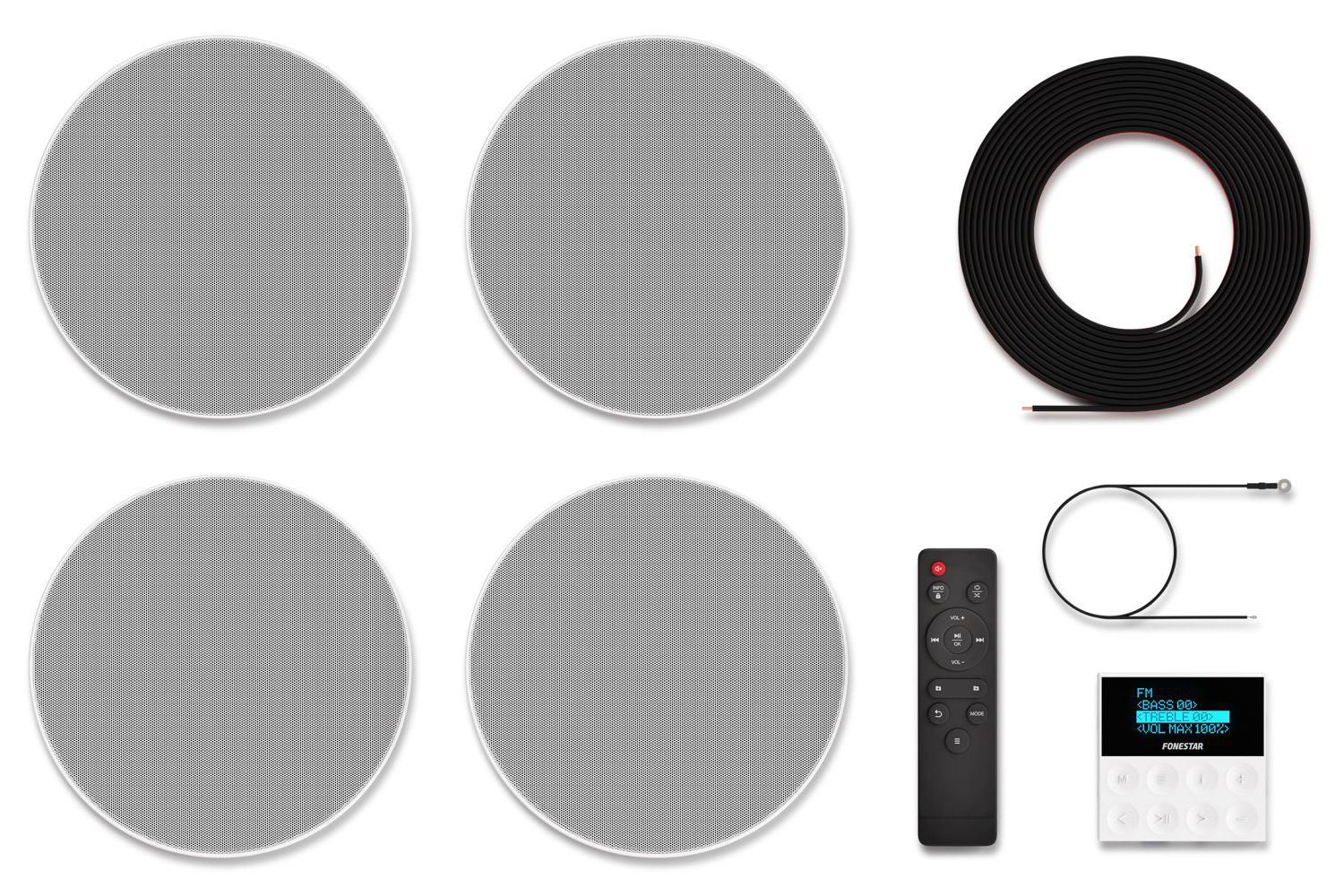 All-in-one sound kit including 4 ceiling speakers and wall amplifier.