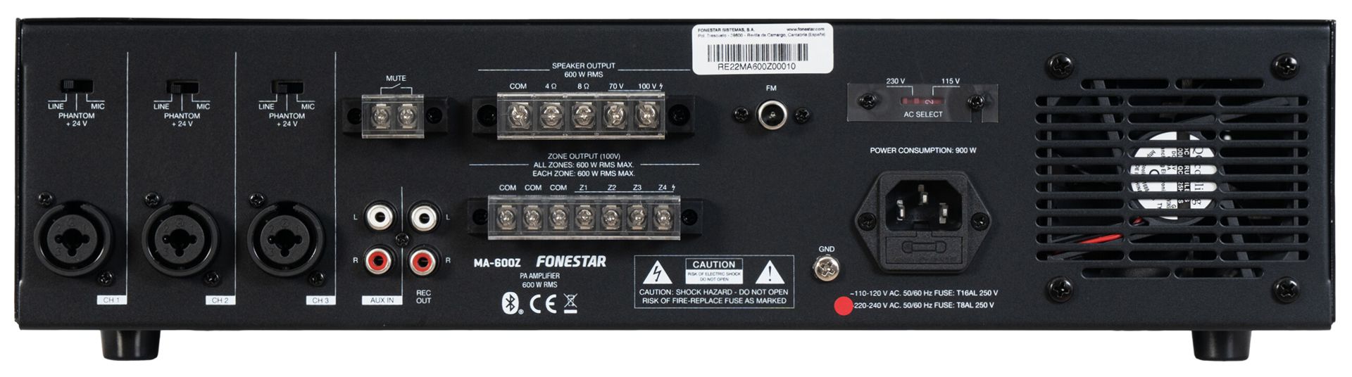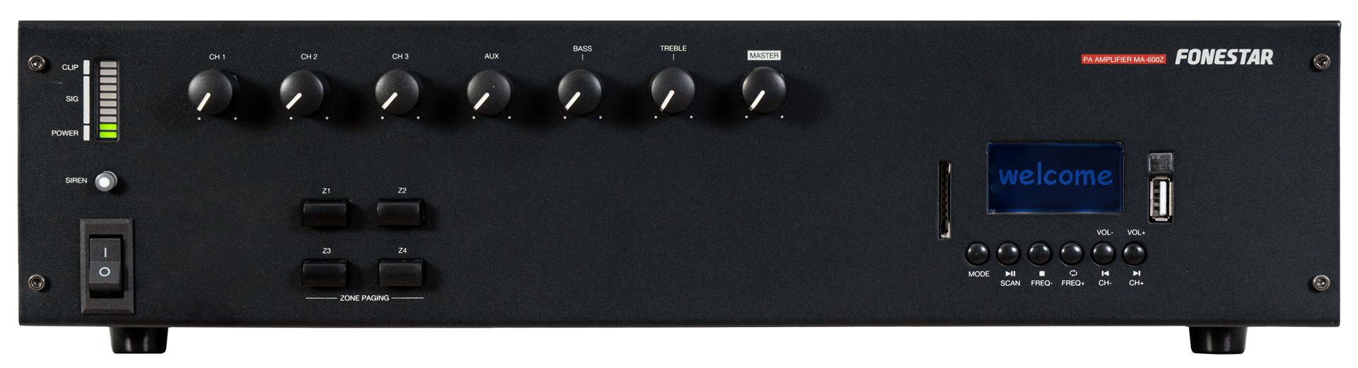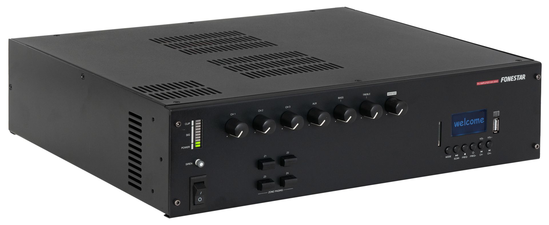 PA amplifier with Bluetooth®/USB/SD/FM player and speaker zone selector.