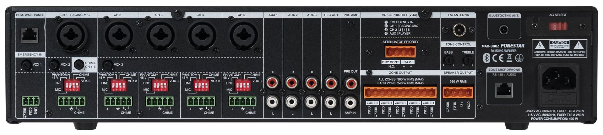 - 100 V, 70 V or 4 Ω loudspeaker output, or 5 zones of 100 V loudspeakers with 7-position volume selector and OFF (max. 240 W per zone)