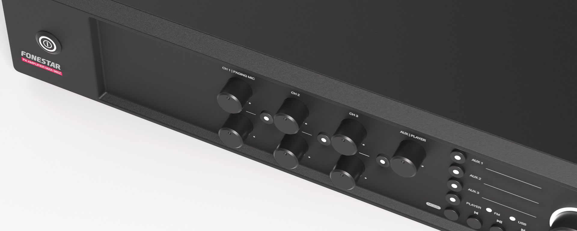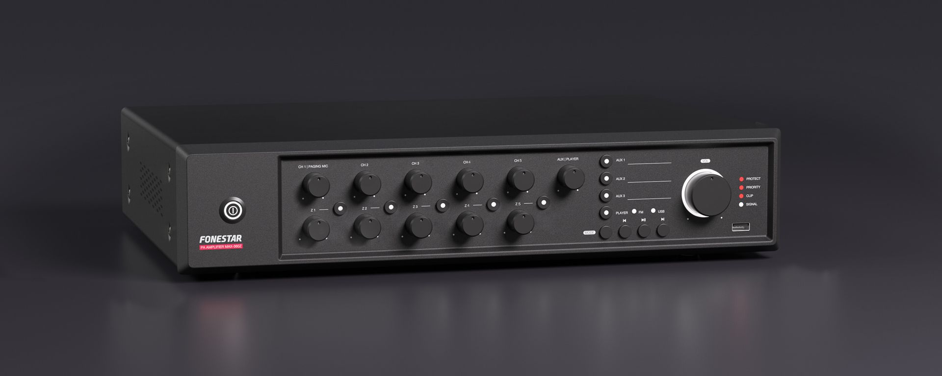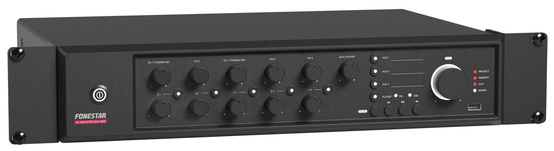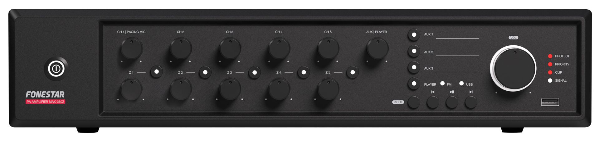 PA amplifier with USB/FM player and speaker zone selector.