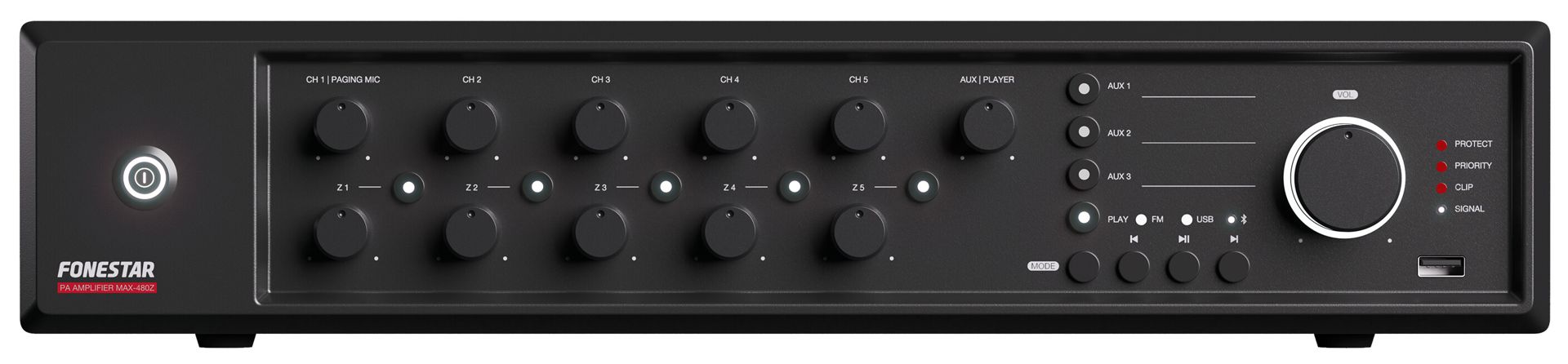 The MAX-480Z is a multi-zone PA amplifier with 480 W RMS power and Class D design, ideal for projects requiring advanced sound control in multiple areas. It features a built-in Bluetooth/USB/FM player and multiple inputs for microphones, emergency systems and auxiliary sources, making it a versatile and efficient tool for professional installations.