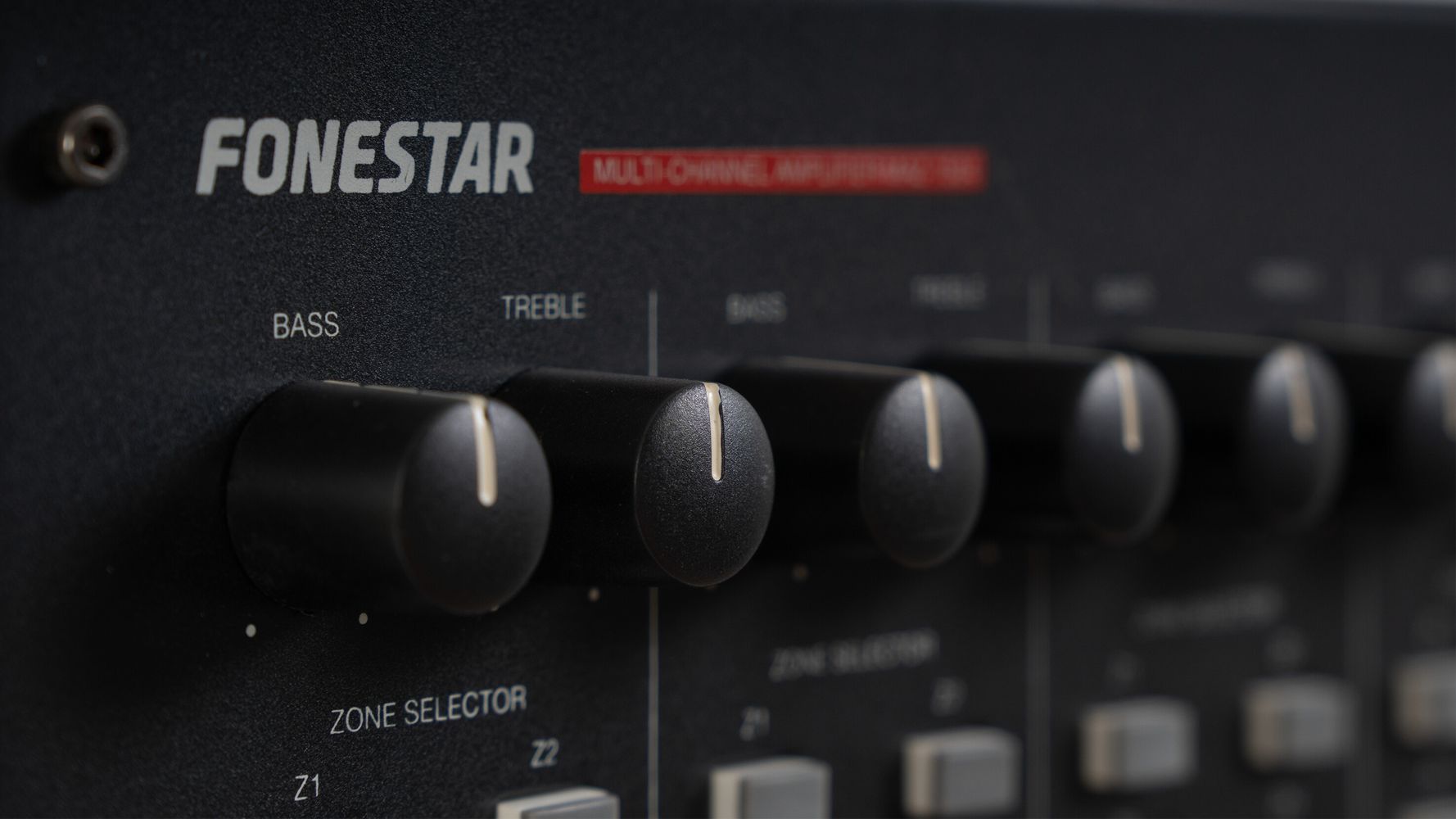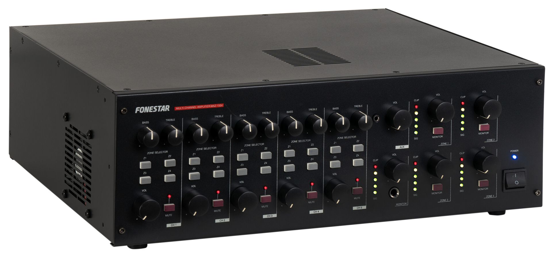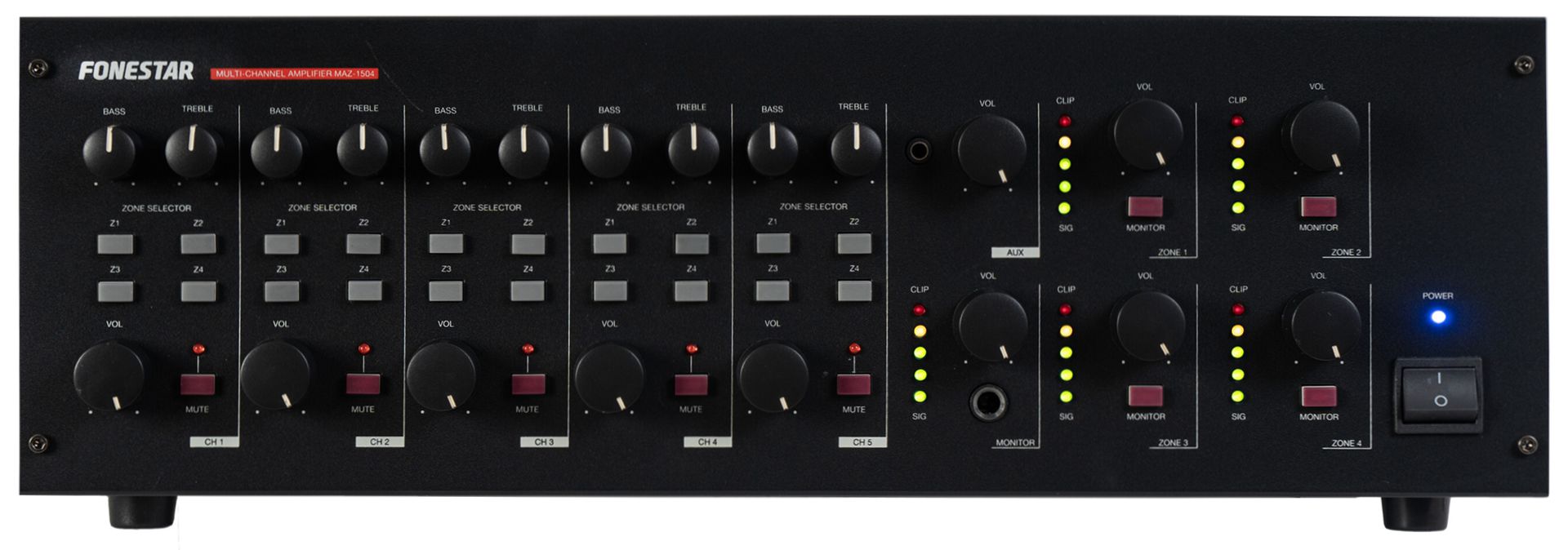 Amplifier for installations with loudspeaker zones, it can play different music in each zone and send each input to different zones, creating an audio system with different music in each zone.