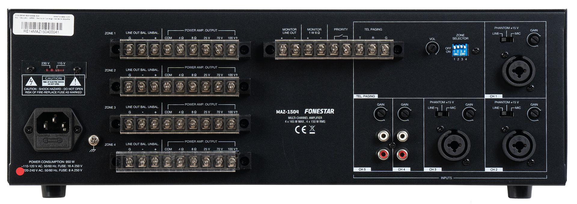 - 4 Ω, 8 Ω and 100/70/25 V line, screw terminals, 4 zones