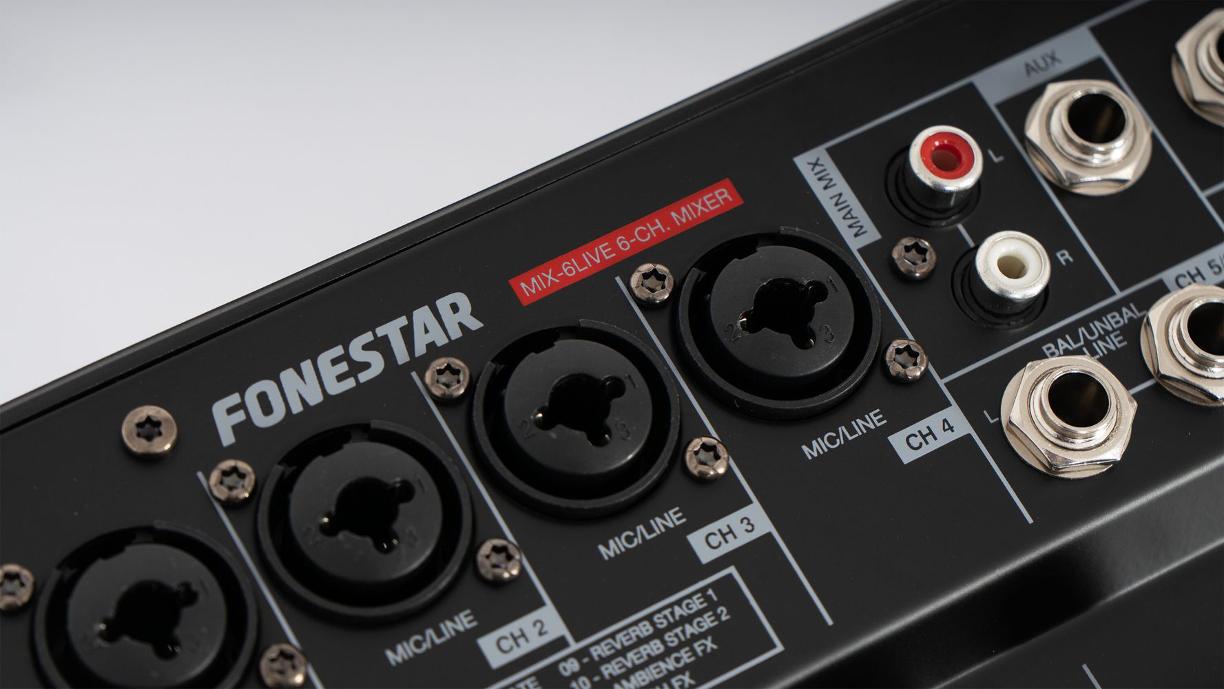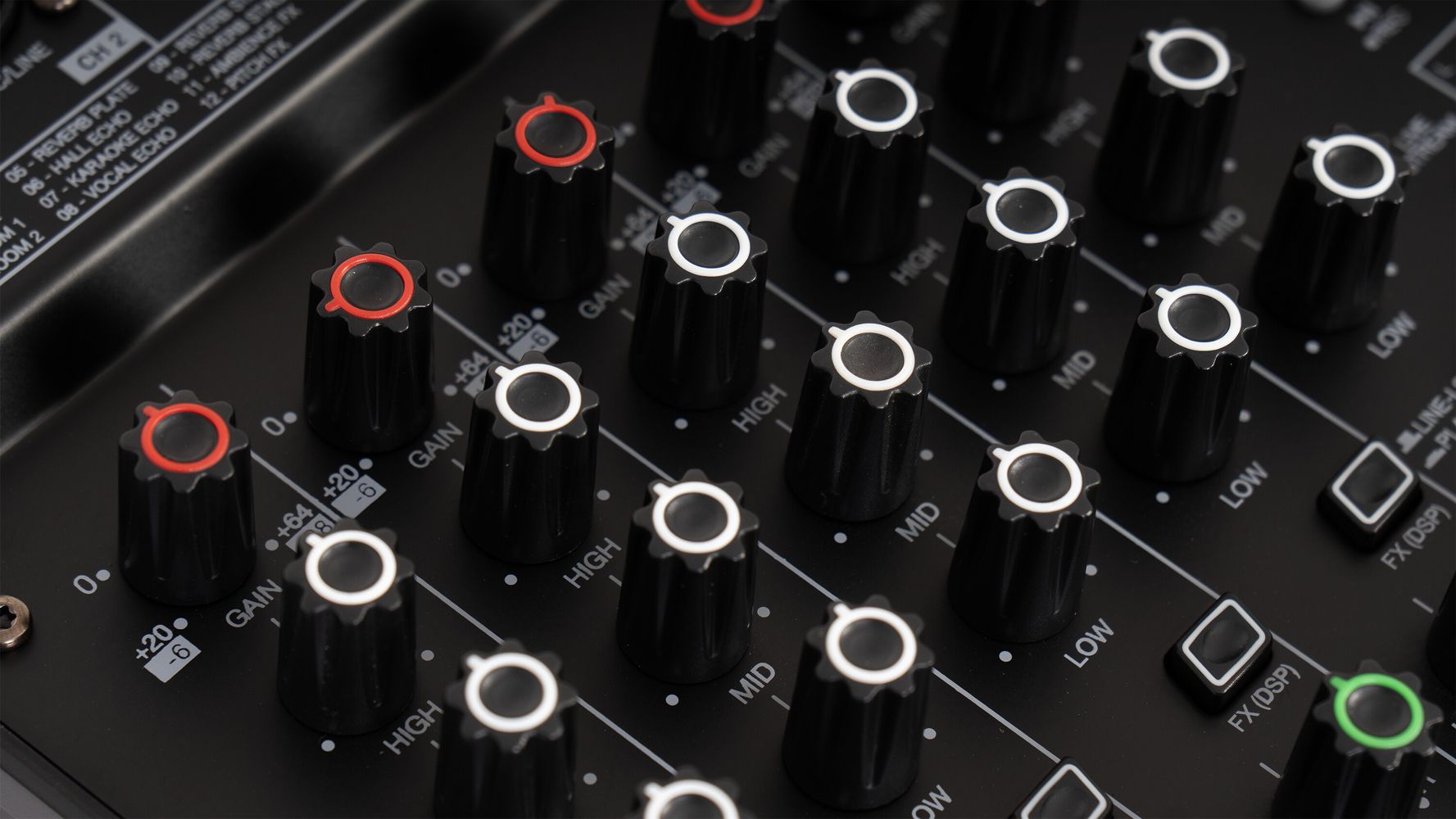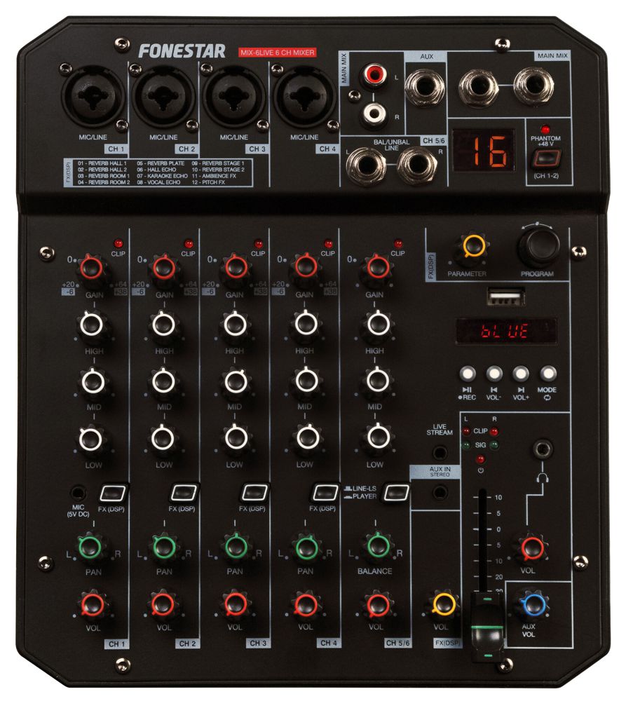 - 6 controls per channel: gain, 3-band EQ, pan, volume, and clip light indicator