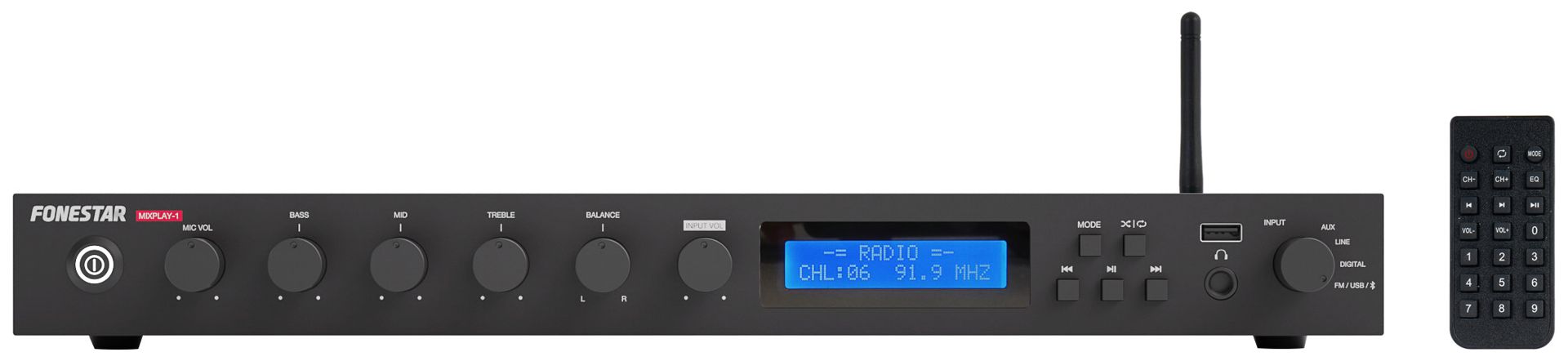 It incorporates a microphone input with priority function that automatically attenuates the music for voice transmission or announcements without worrying about touching the settings. Mixes the microphone signal with one of the multiple inputs or the Bluetooth player.