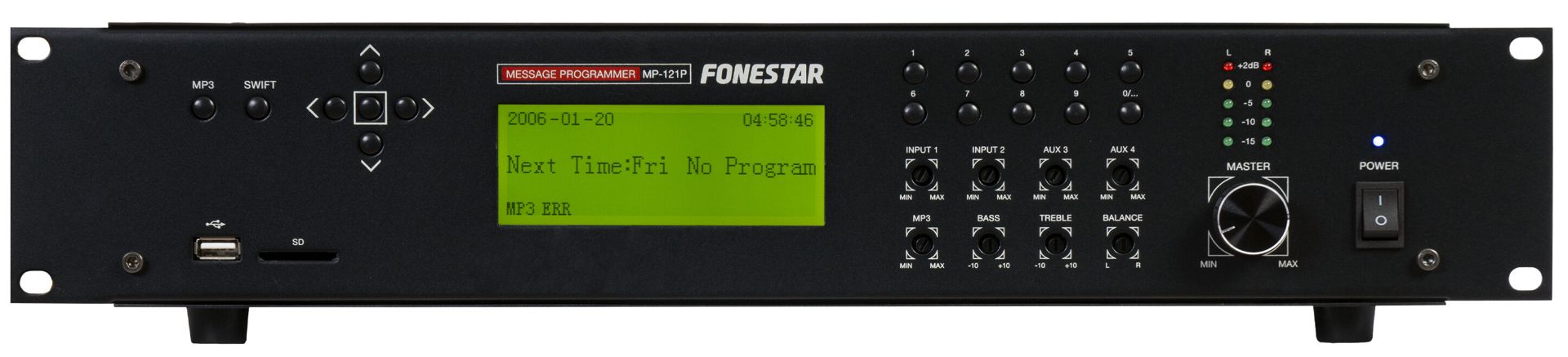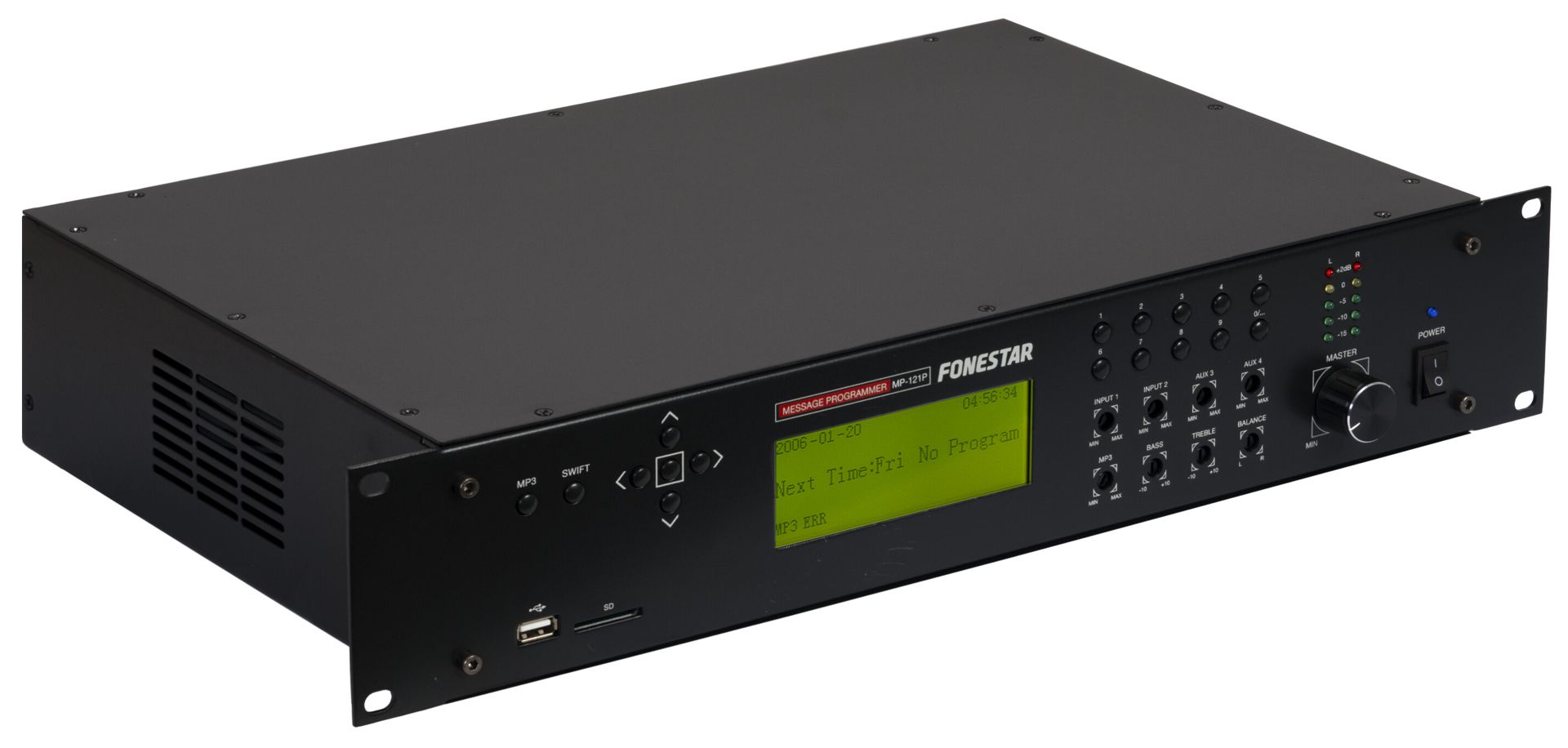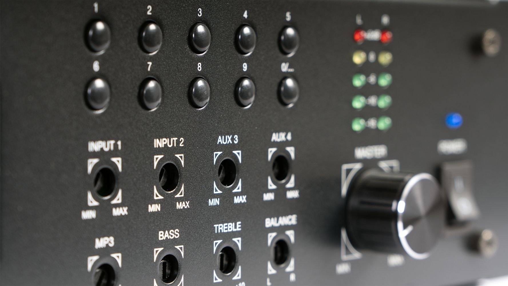 - Volume: input 1 and 2, aux 3 and 4, USB/SD and general volume