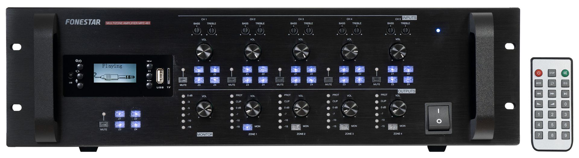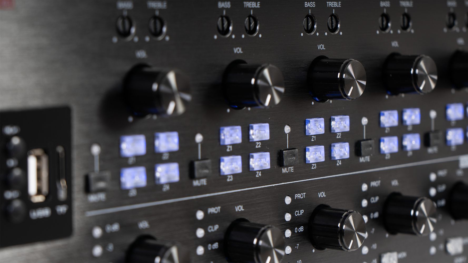Multi-zone matrix amplifier with 5 input channels, wireless receiver and USB/microSD player with FM radio that can be assigned to any of the 4 output zones.
