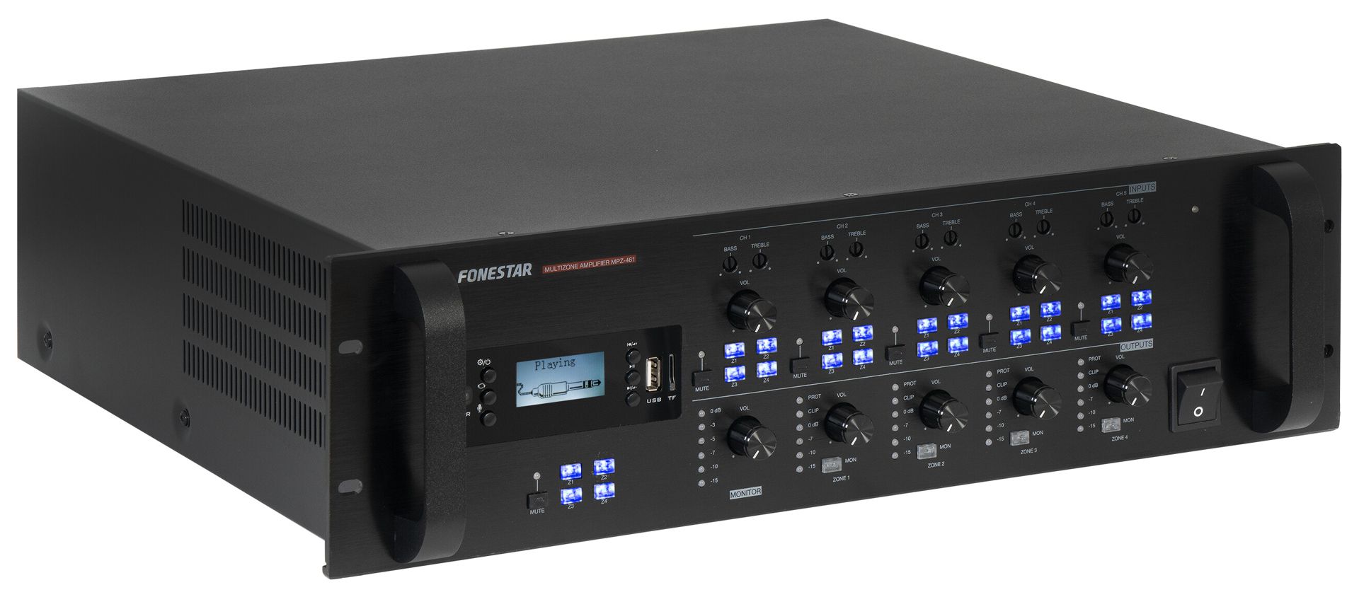 - Matrix assignment of 5 input channels and player to 4 output zones