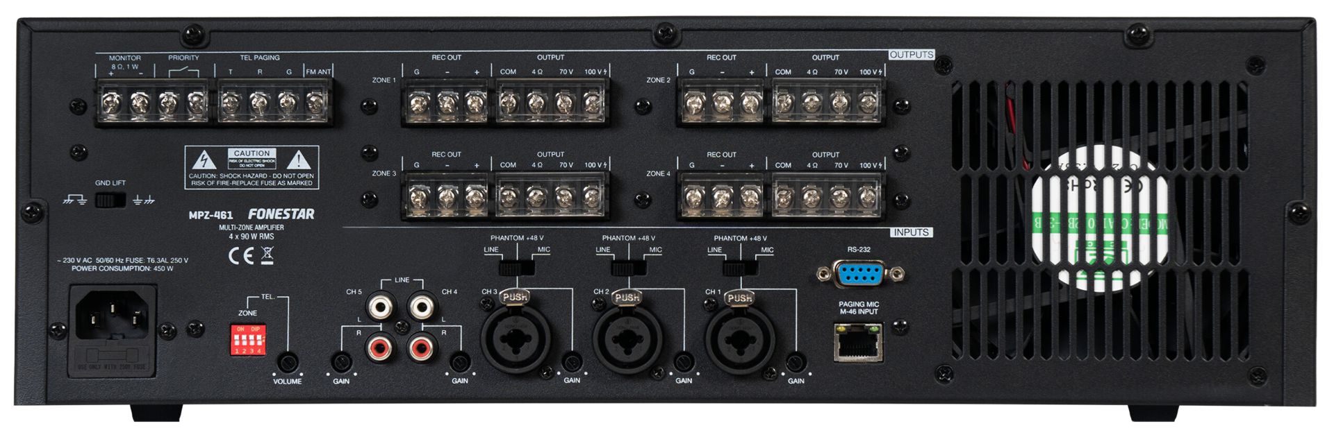 - 4 zones: 4 Ω and 100 and 70 V lines, screw terminals