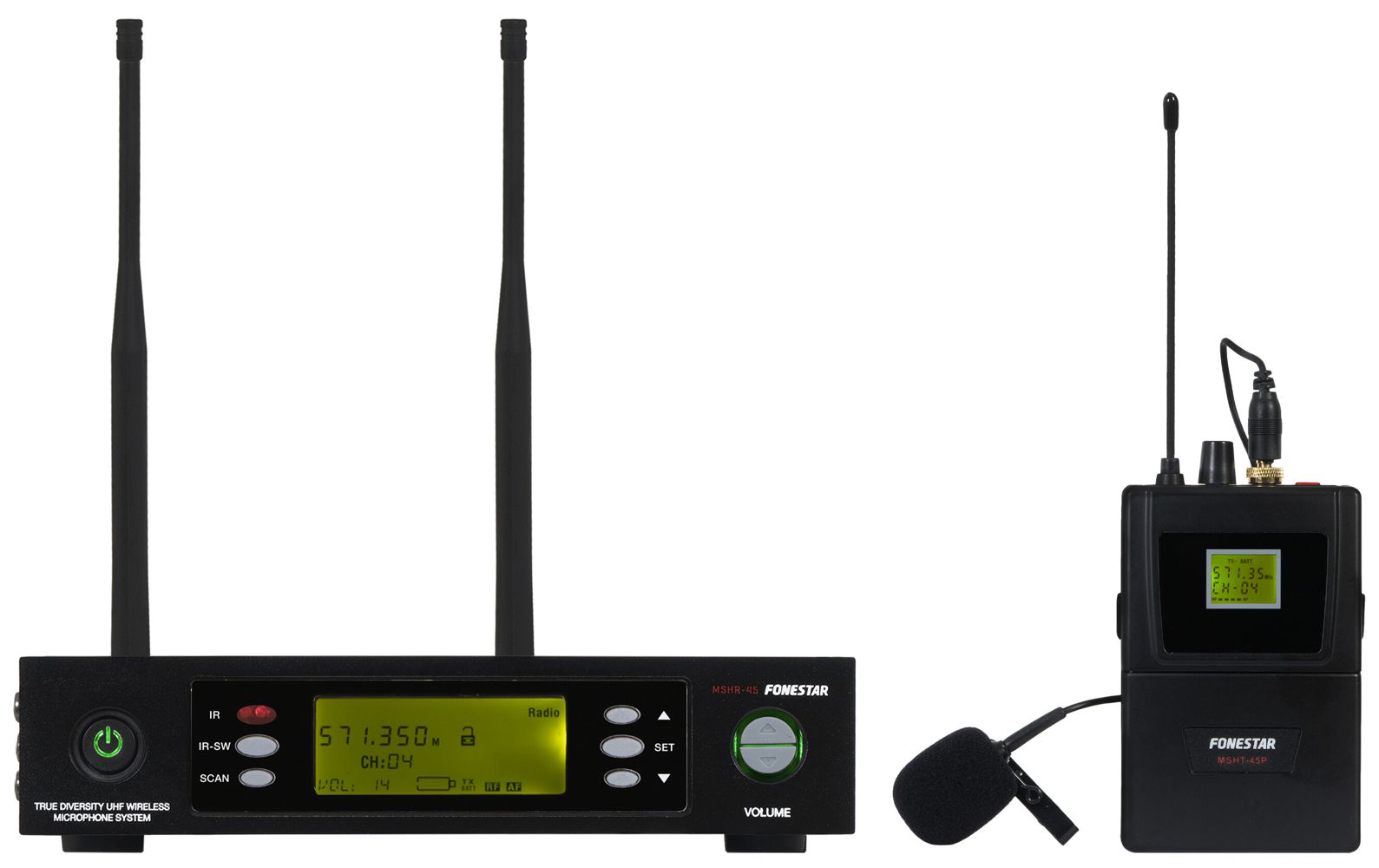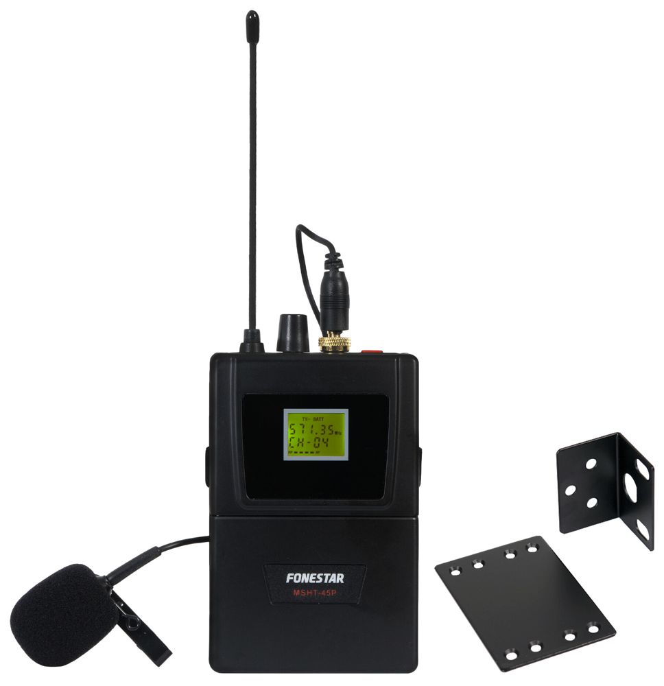 • 1 tie-clip microphone with unidirectional electret condenser capsule and wireless belt-pack transmitter with mic./line input sensitivity selector