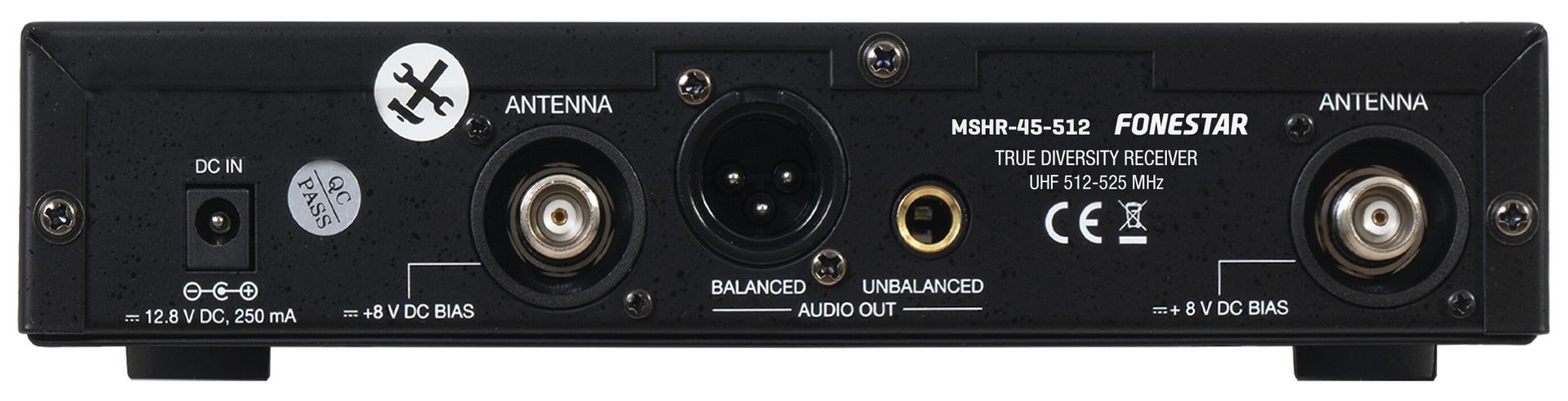 It has 32 selectable channels from 512 to 525 MHz, with auto scan function and transmission of the channel to the microphone via IR.
