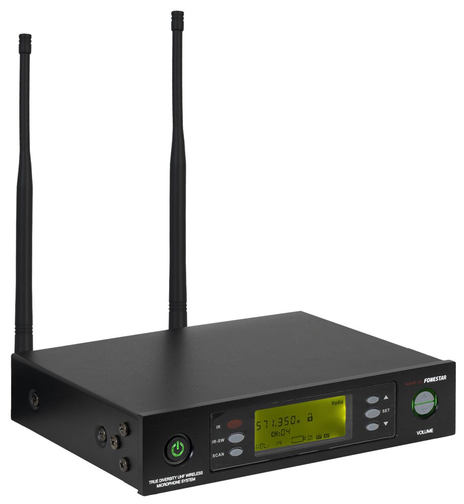 It has 32 selectable channels from 512 to 525 MHz, with auto scan function and transmission of the channel to the microphone via IR.