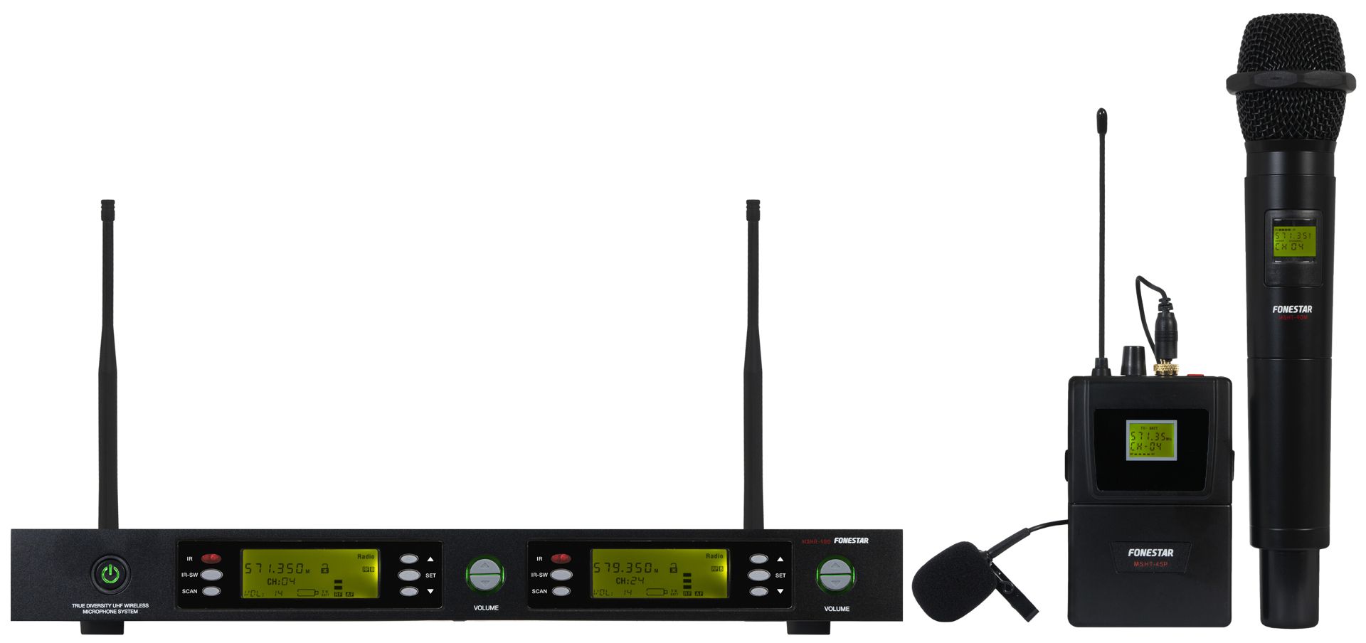 - True Diversity receiver with 1 hand-held wireless microphone with unidirectional electret condenser capsule and 1 clip-on microphone with unidirectional electret condenser capsule and wireless belt-pack transmitter