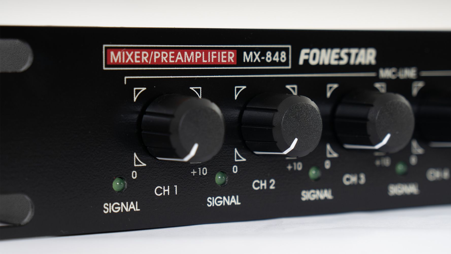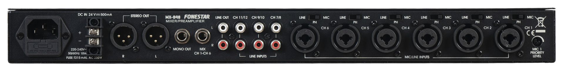 Passive mono mixer with 6 balanced micro/line level input channels and 3 stereo auxiliaries.