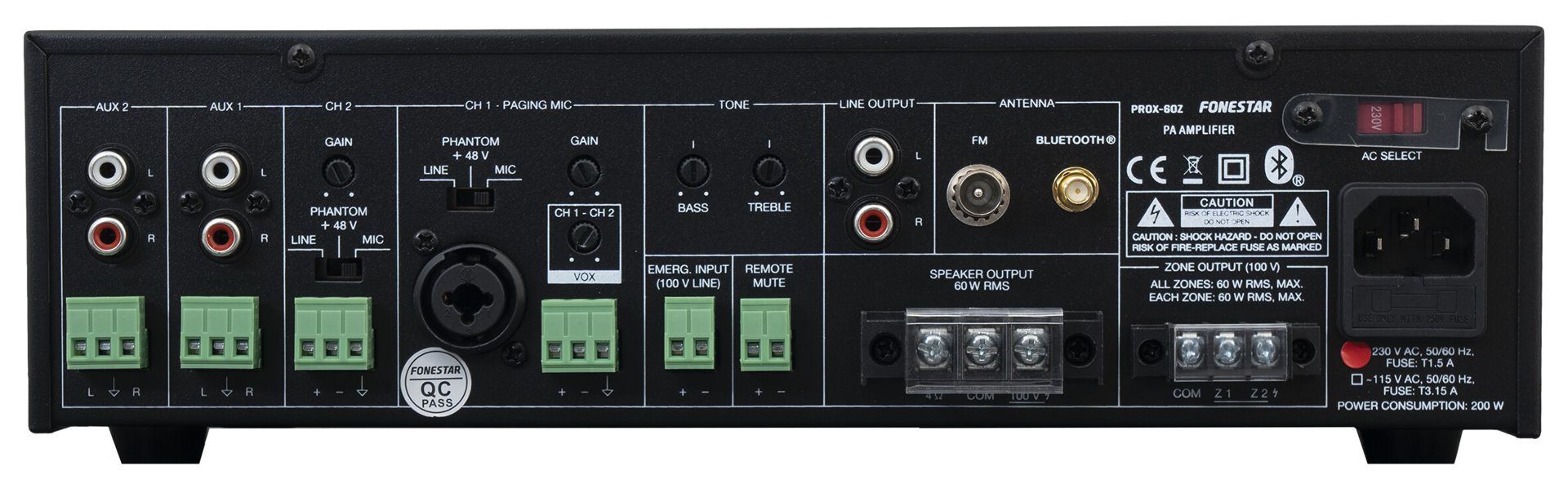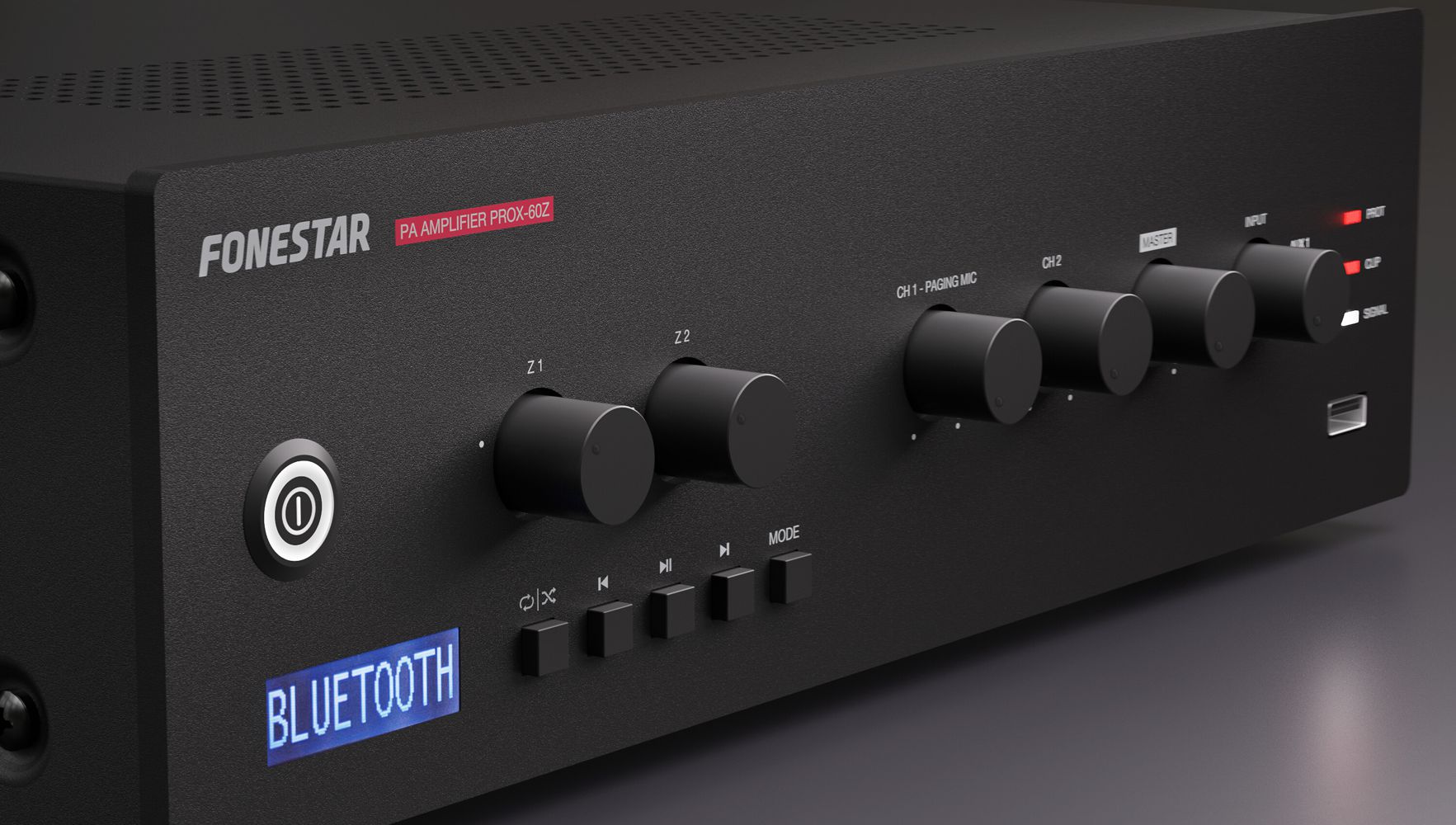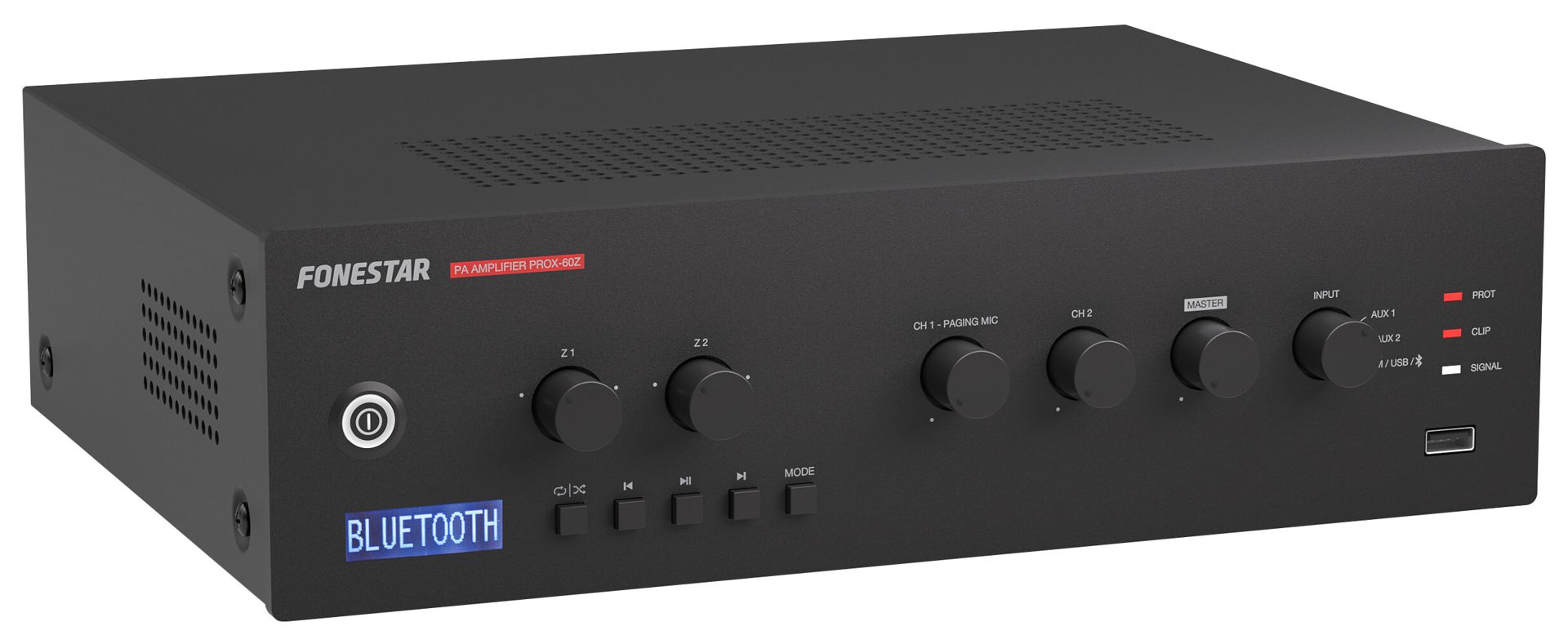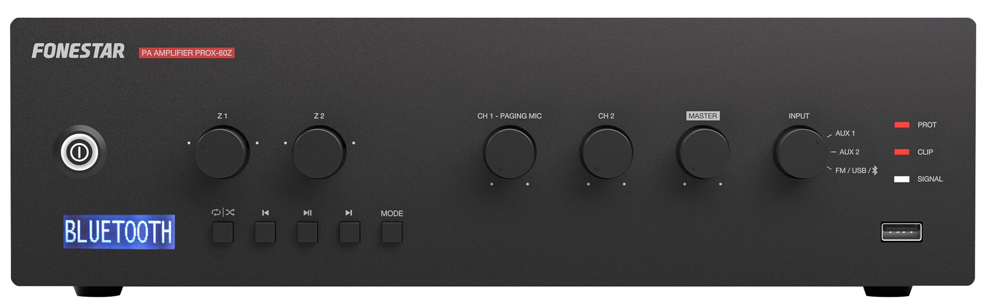 PA amplifier with Bluetooth®/USB/FM player and speaker zone selector