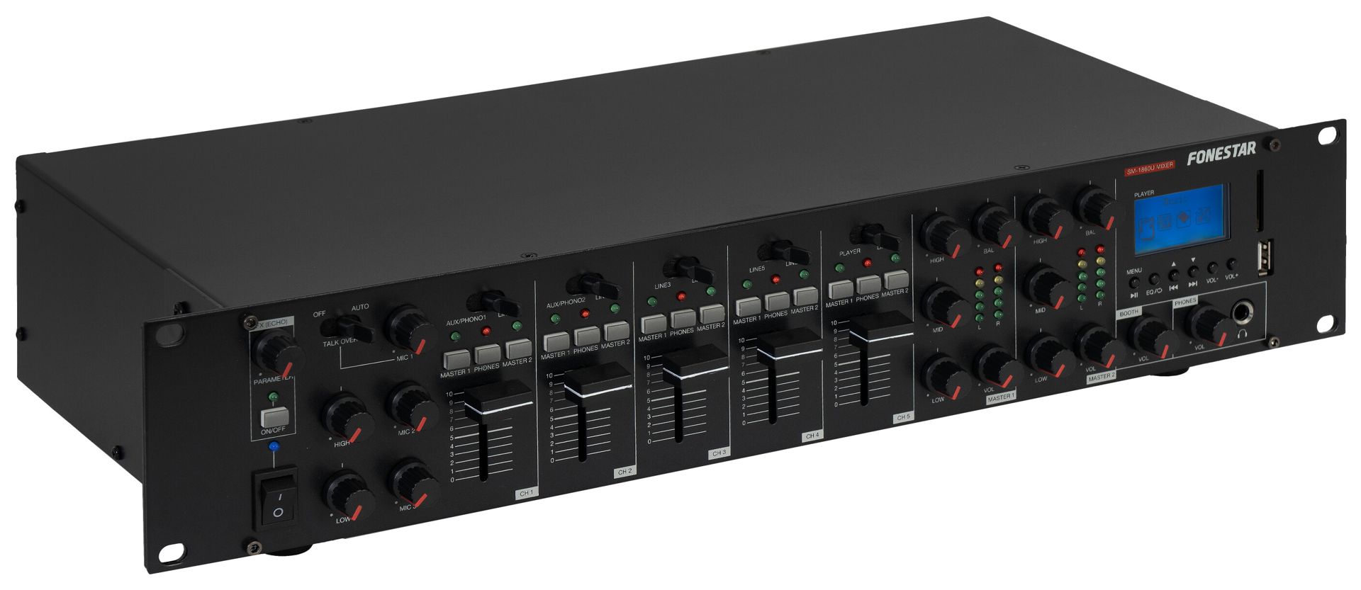 - MIC2 and MIC3: volume, bass (± 12 dB, 100 Hz), treble (± 12 dB, 10,000 Hz) and echo effect
