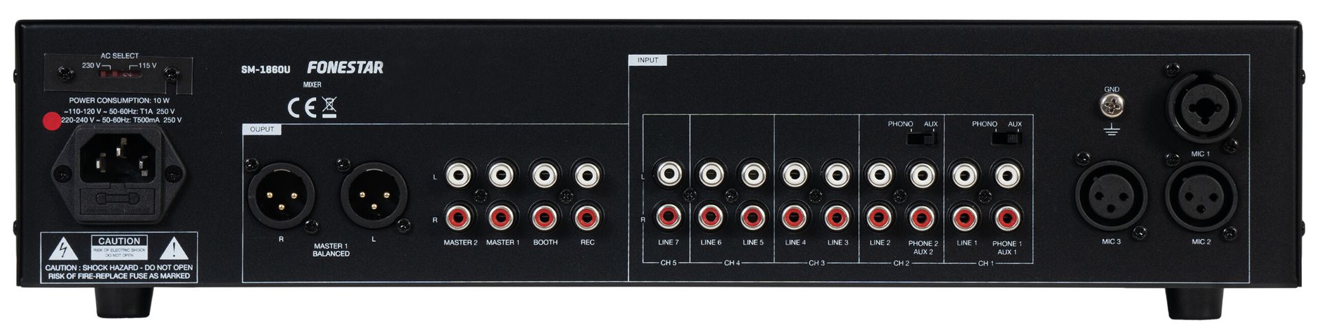 - Master 1 (2 x XLR and 2 x RCA), master 2 (2 x RCA), recording (2 x RCA), booth (2 x RCA) and stereo headphones (6.3 mm jack)