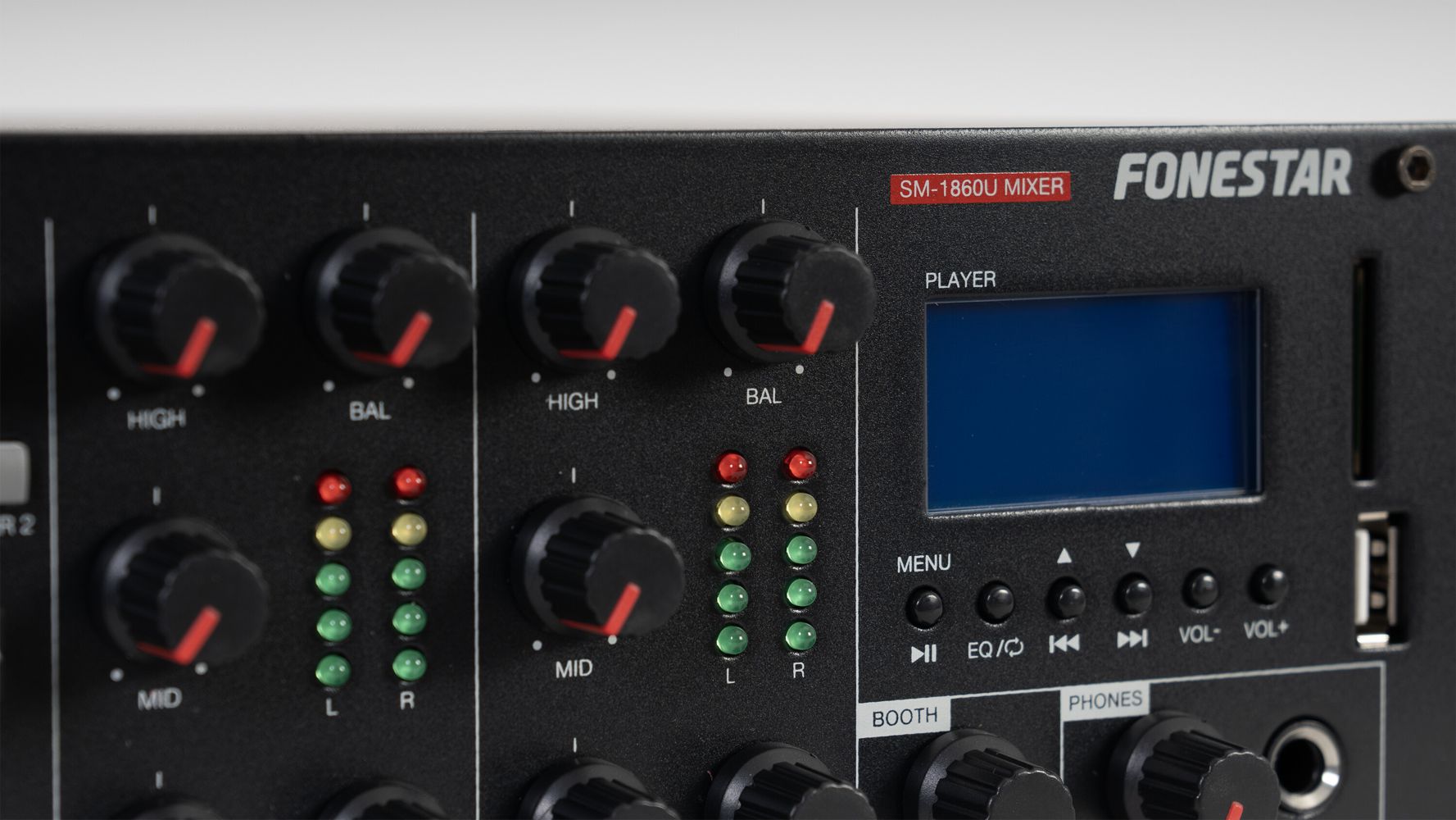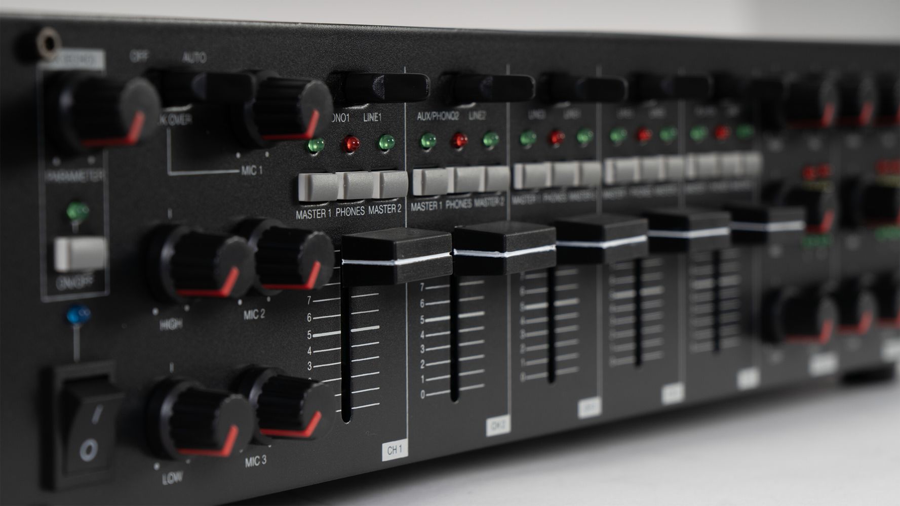 - Master 1 and master 2 output: volume, bass (+12, - 32 dB, 100 Hz), mid (+12, -32 dB, 1,500 Hz) and treble (+12, -32 dB, 10,000 Hz), mid and treble, balance and level indicator
