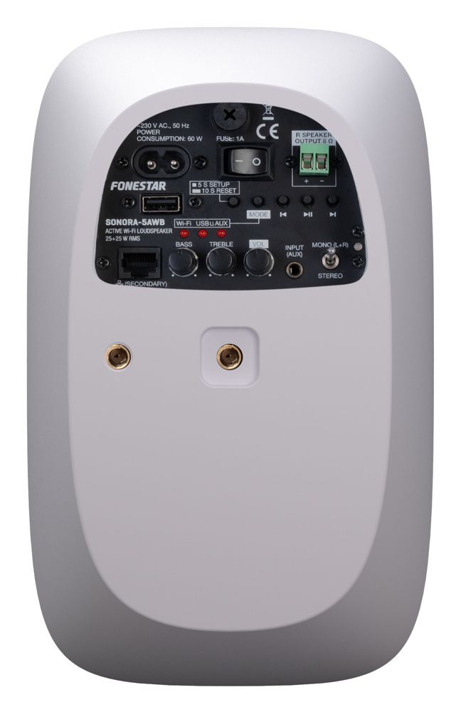 Play music from your smartphone, tablet, Windows or Mac, via Wi-Fi (2.4 GHz). It has an App for control from smartphones and tablets (iOS and Android), which allows you to connect to online music services and internet radio, send the same music programme to several speakers at the same time with the multiroom function (see note), control the volume of each speaker, customise its name, among other options. It can also play from USB or auxiliary input.