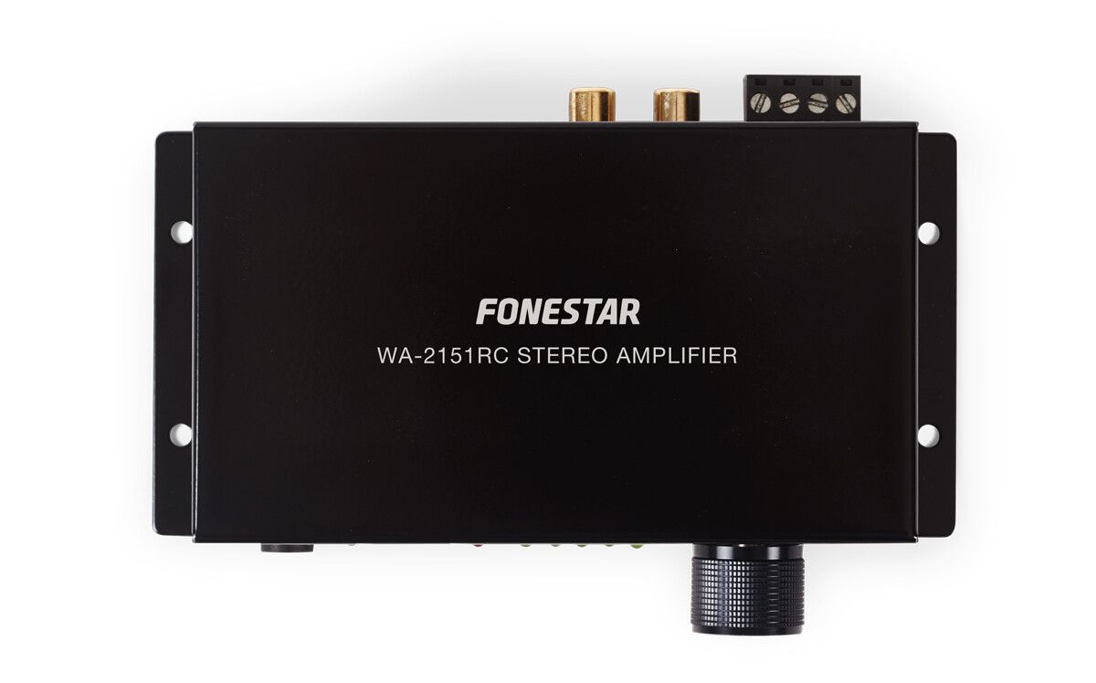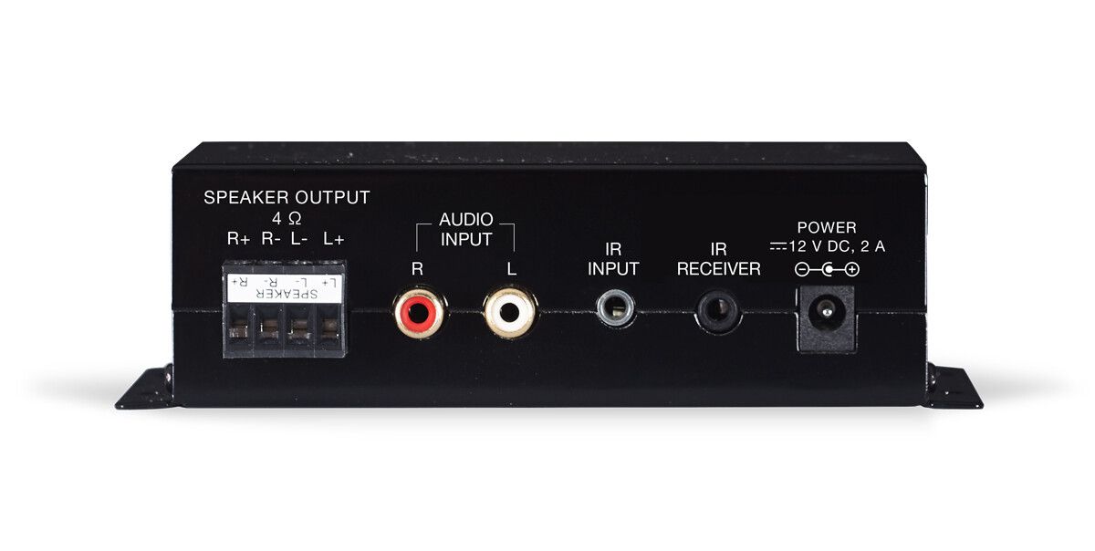 Class D stereo amplifier, 2 x 15 W RMS with remote control.