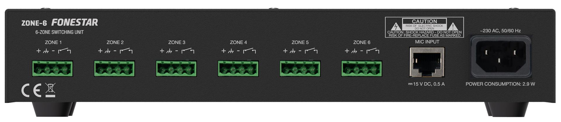 - Connection to the ZONEMIC-6 paging microphone, connection of up to 4 microphones